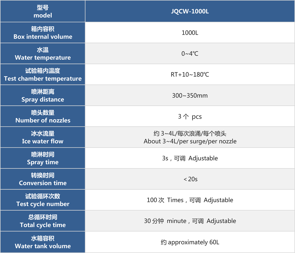 產(chǎn)品型號(hào):JQCW-1000L 品牌:劍 喬 用途:冰水沖擊試驗(yàn)(浪涌水的溫度沖擊試驗(yàn))是模擬部件在駛過(guò)積水時(shí)而產(chǎn)生的浪涌水的負(fù)荷情況,保證部件由于水而急劇冷卻情況下的功能穩(wěn)定性。如車(chē)輛在冬季有水路面駕駛時(shí)冰水濺落到熱的系統(tǒng)/組件上,失效模式為不同的溫度膨脹系數(shù)導(dǎo)致的材料機(jī)械破裂或密封失效咨詢(xún)熱線(xiàn):13829135130
